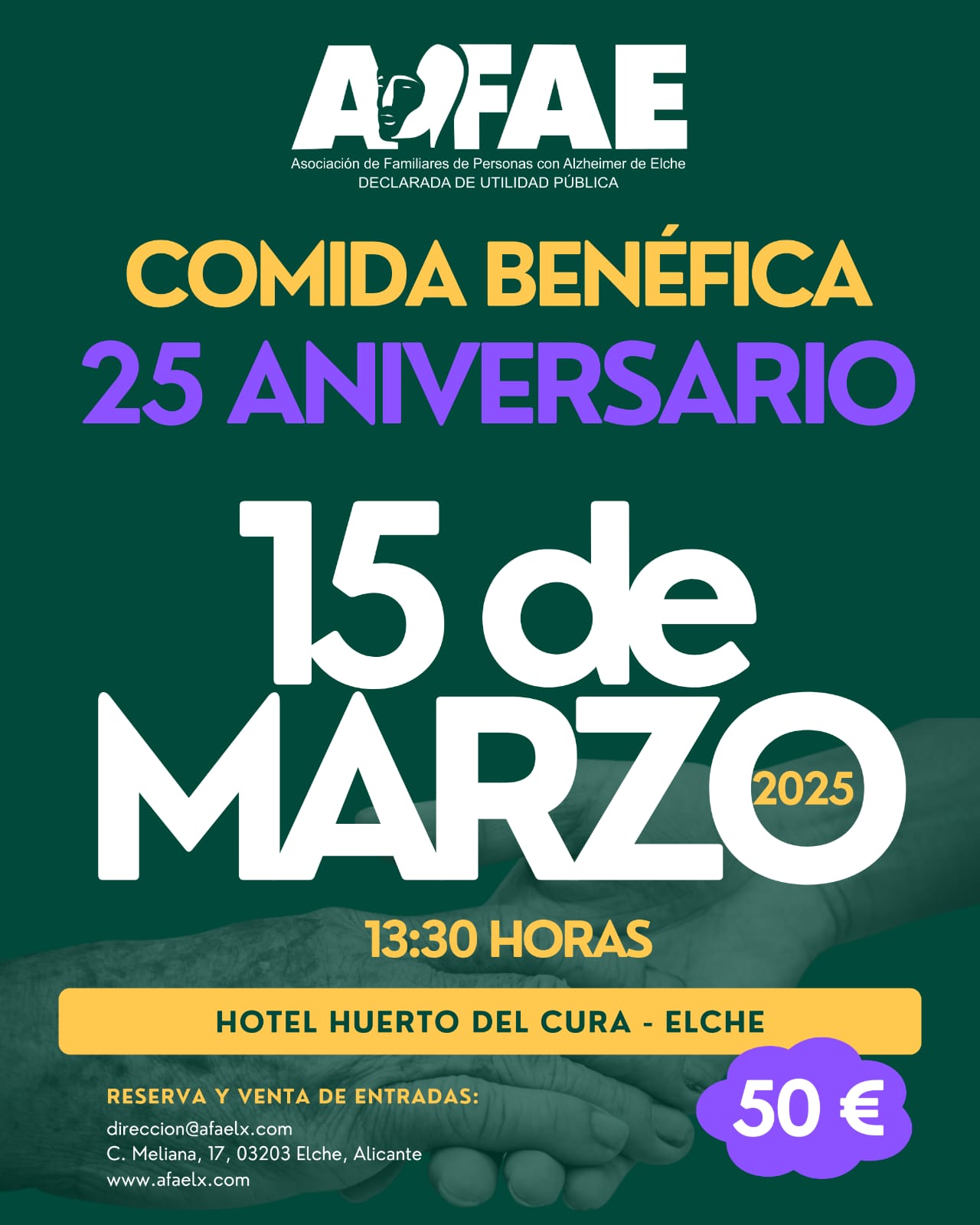 Desde Media Caña, nos unimos a la Asociación de Familiares de Personas con Alzheimer de Elche (AFAE) en la celebración de su 25º aniversario, colaborando en la difusión de su gala solidaria, que tendrá lugar el próximo 15 de marzo a las 13:30 horas en el Hotel Huerto del Cura de Elche.